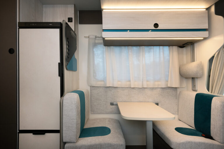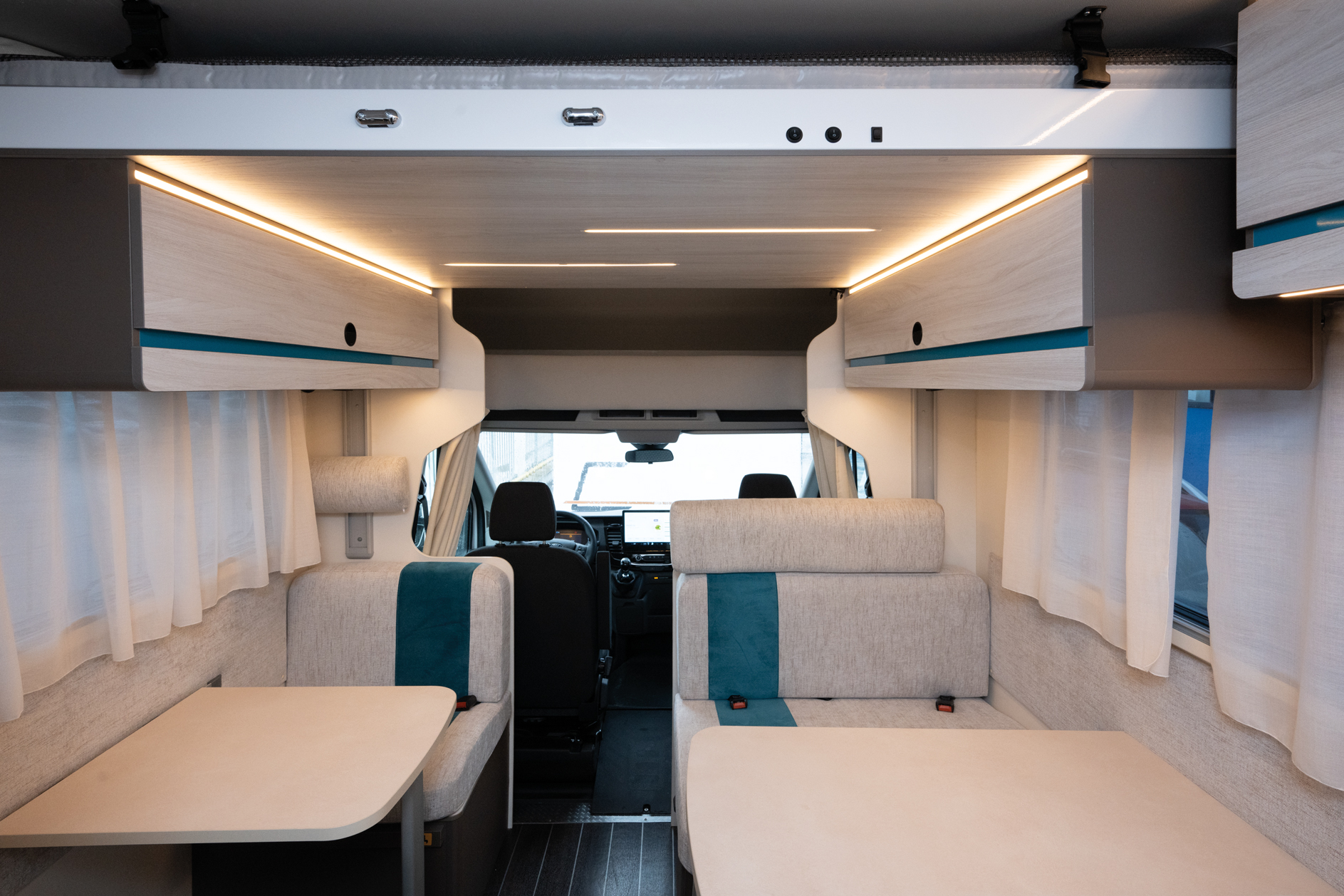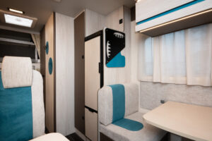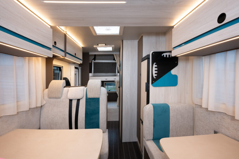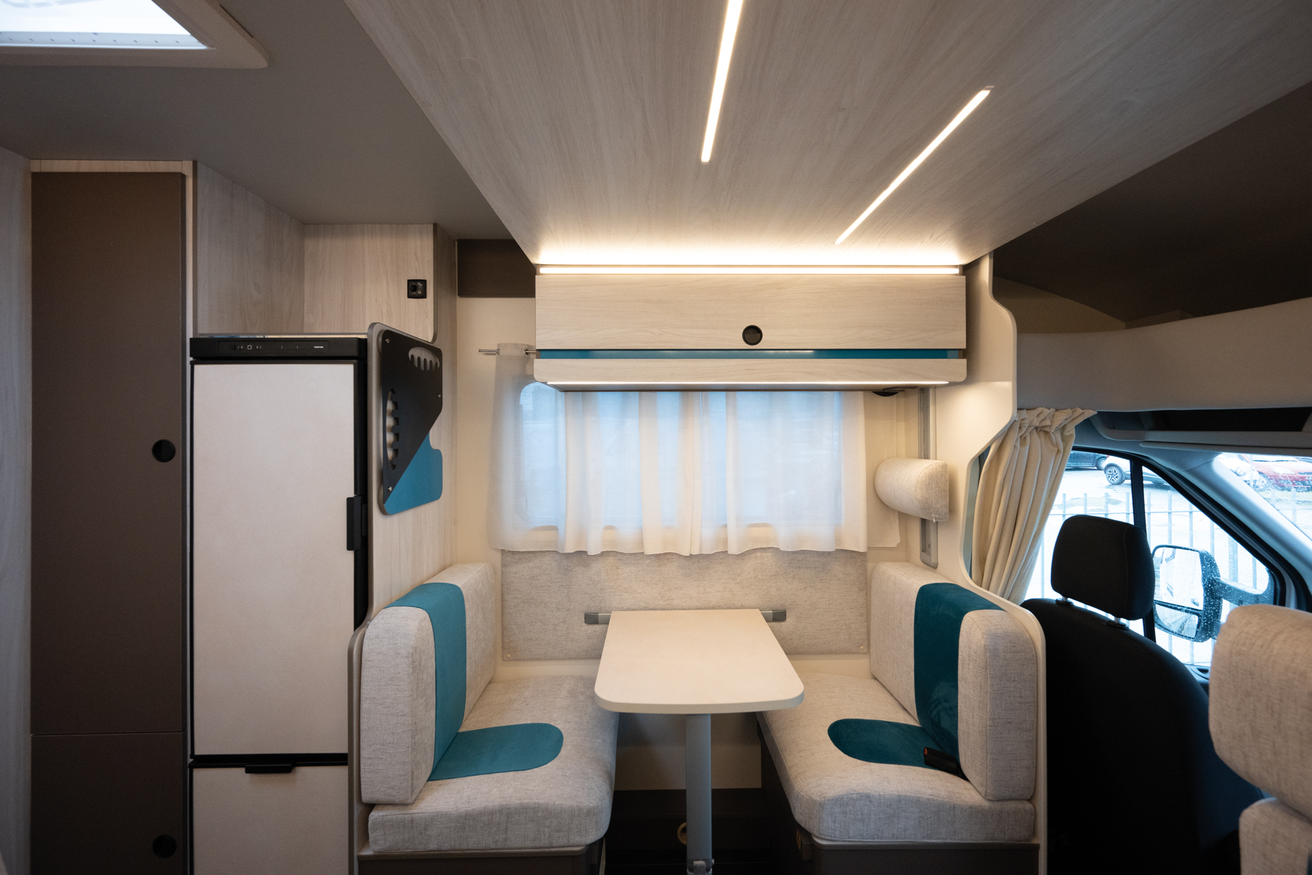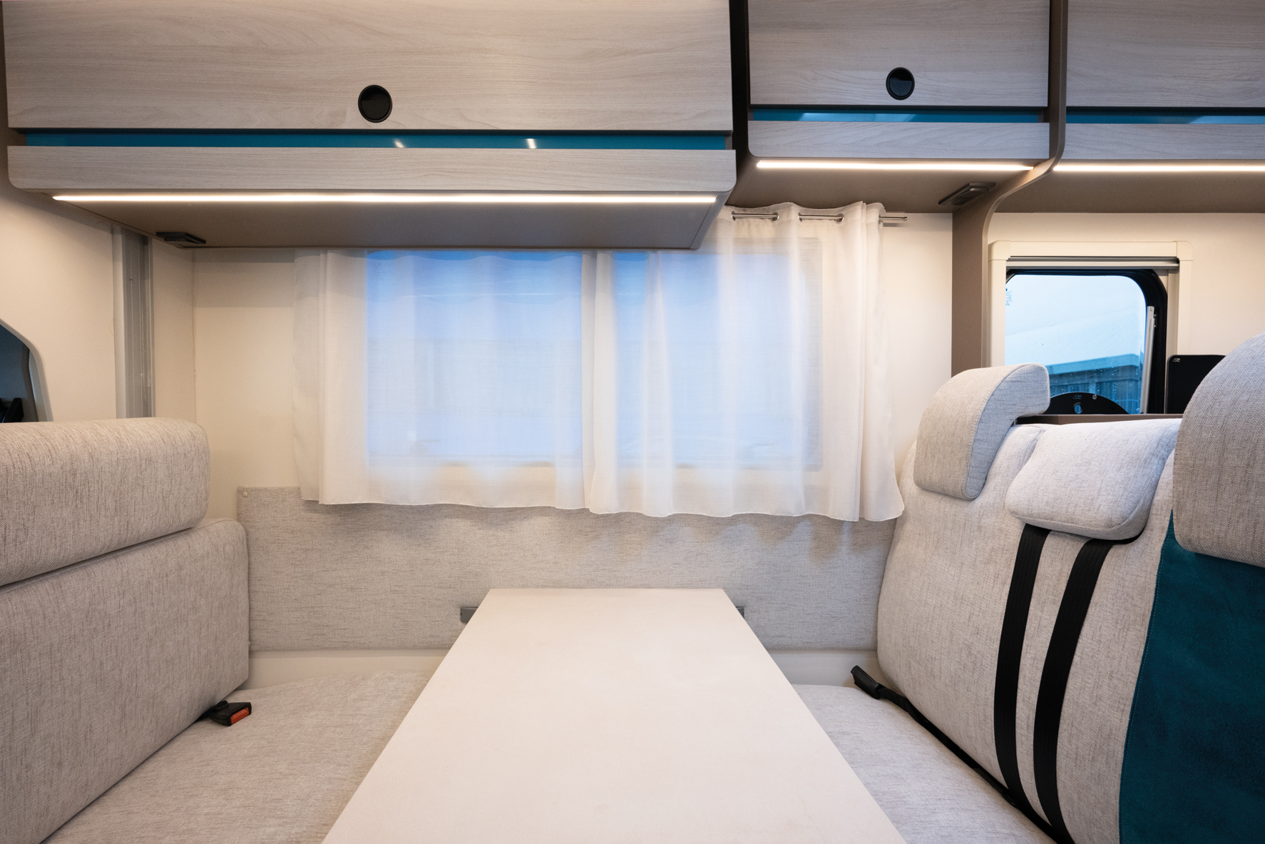 Ο εσωτερικός χώρος του Kilig 79 Plus ξεχωρίζει για τη σωστή κατανομή ύπνου και καθημερινής διαβίωσης. Οι πίσω κουκέτες, το εμπρόσθιο αναδιπλούμενο κρεβάτι και η κεντρική τραπεζαρία δημιουργούν ένα λειτουργικό περιβάλλον για πολλές θέσεις ύπνου χωρίς να περιορίζεται η κυκλοφορία στον χώρο. Η εργονομική κουζίνα και το πλήρως εξοπλισμένο μπάνιο εξασφαλίζουν πρακτικότητα, ενώ οι αποθηκευτικοί χώροι καλύπτουν τις ανάγκες οικογενειακών ταξιδιών μεγάλης διάρκειας.